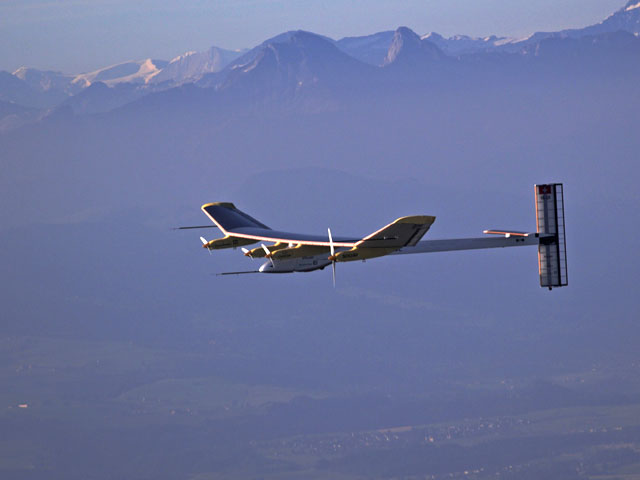 "Солнечный импульс", сконструированный в Швейцарии, приводится в движение четырьмя моторами мощностью 10 лошадиных сил каждый. Они питаются от 400-килограммового литиевого аккумулятора, который заряжается от размещенных на крыльях фотоэлементов.