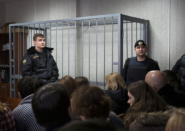 Тут же неподалеку — адвокаты неявившихся «по уважительным причинам» подсудимых. И пустая клетка. Четверо дюжих приставов, руки по швам, готовые в любую минуту броситься в зал, охраняли судью Алисова от публики. Кажется, они начали появляться на резонансных процессах с тех пор, как в Мещанском суде слушали первое дело Михаила Ходорковского и Платона Лебедева. Точно так же приставы охраняли от публики судью Виктора Данилкина в Хамовническом суде и судью Марину Сырову, когда она оглашала приговор по делу Pussy Riot.