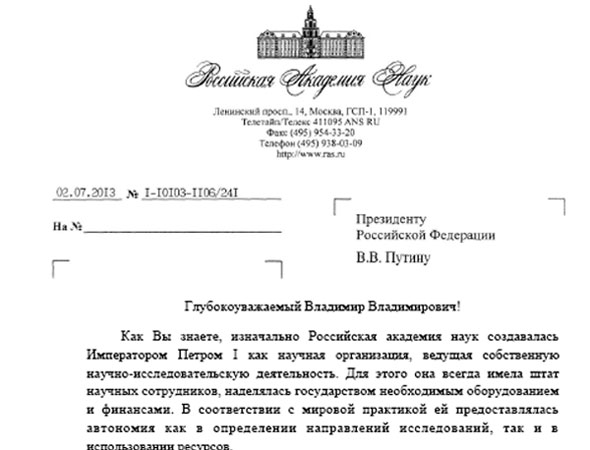 Письмо и.о. президента РАНа академика Владимира Фортова президенту Владимиру Путину