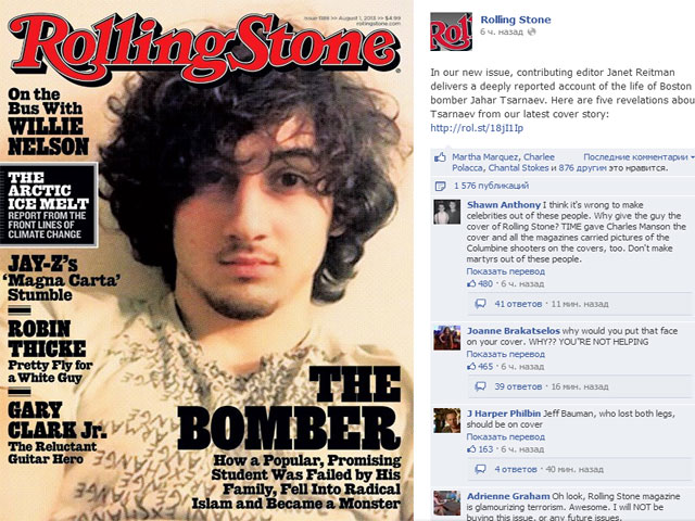 Анонс нового номера был также опубликован на странице Rolling Stone в сети Facebook. За три часа сообщение набрало несколько сотен гневных комментариев. "Вам должно быть стыдно", - пишет один из пользователей. "Больше никогда не куплю журнал, пострадавшие должны быть на обложке, какая безвкусица", - вторят другие подписчики страницы. "Какая удача, что моя подписка на журнал закончилась", - цитирует комментарии РИА "Новости".