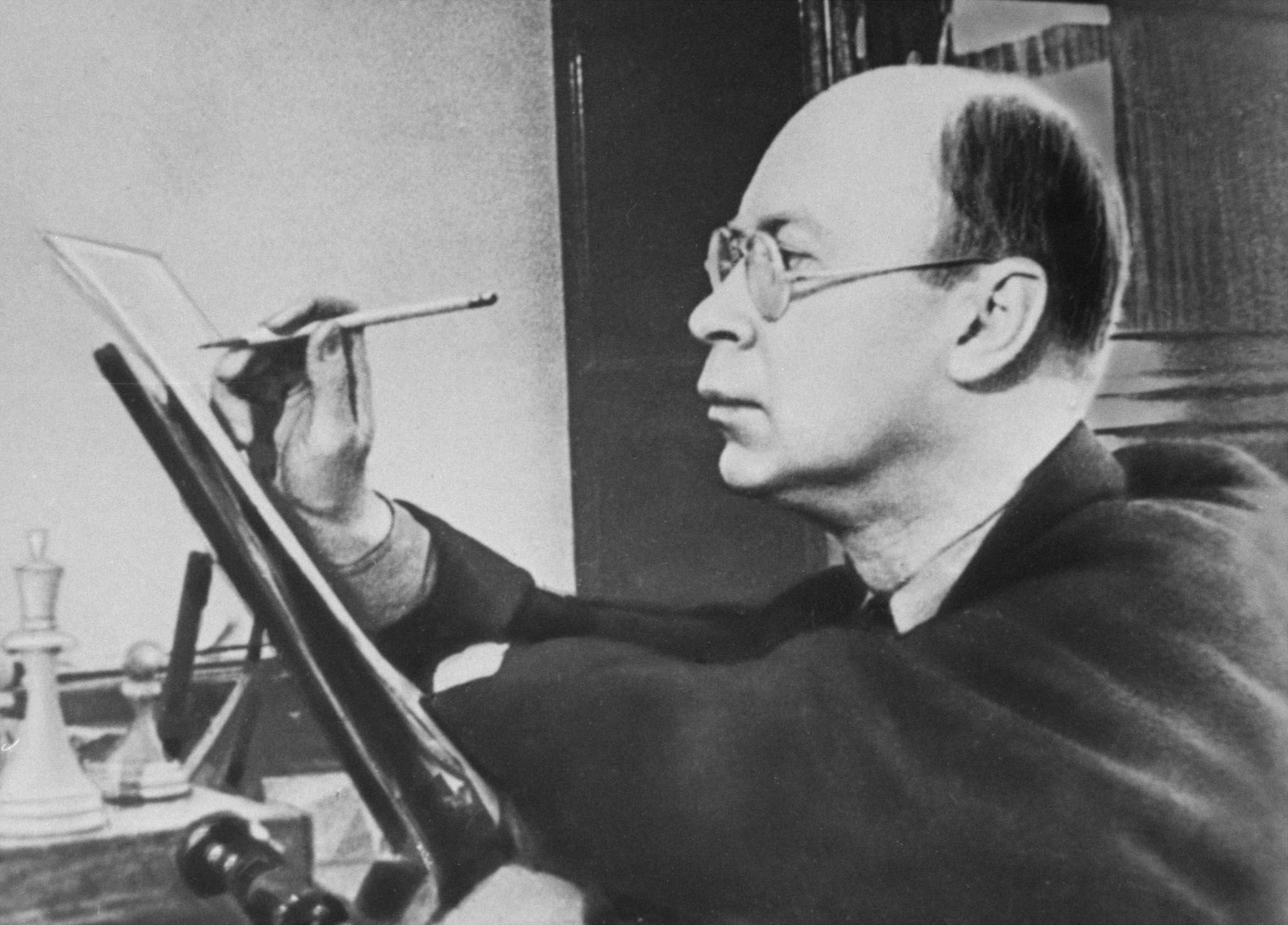 Диктор: «Связанный новыми условиями, Прокофьев писал «массовые» песни, детскую музыку (включая «Петю и волка») и «Кантату на 20-летие Октябрьской революции». Но в 1938 г. он начал с энтузиазмом работу над фильмом Эйзенштейна «Александр Невский», потом над оперой «Семен Котко» - для Мейерхольда. В 39-м Мейерхольда арестовали, а Прокофьеву предложили написать “Здравицу к 60-летию Сталина».