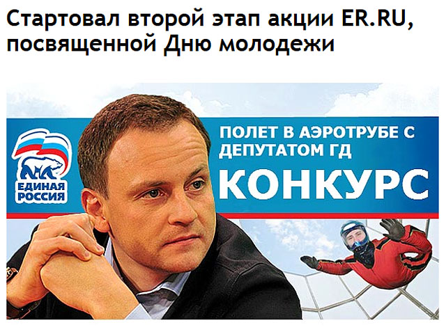 Партия "Единая Россия" организовала необычный конкурс к Международному дню молодежи: участникам предлагается посоревноваться в сочинении самого лучшего девиза для этого мероприятия. Приз - полет в аэротрубе с депутатом-единороссом Александром Сидякиным, сообщается на официальном сайте партии.