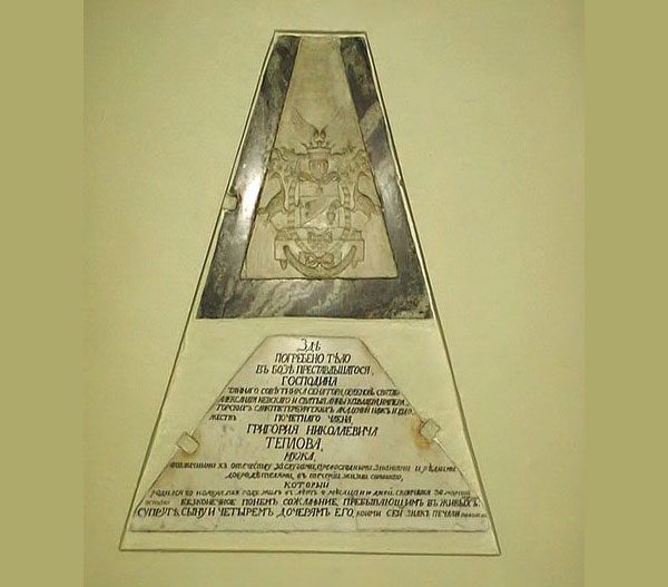 Надгробие Григория Теплова в Лазаревской усыпальницеоднако, прожив вещи, которыми он ее «наградил», пользовалась от него пособием по 1000 рублей в год, хотя у нее было свое, доставшееся от отца, имение в местечке Басани возле селения Пески. Теплов, несмотря на все, отпишет ей значительное наследство, видимо, в качестве своеобразного извинения.