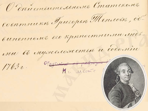Это одно из первых дел Тайной экспедиции, от 3 июля – 10 октября 1763 года, в архивной описи называется «О дѣйствительномъ Статскомъ совѣтнике Григорьѣ Тепловѣ, обвиненномъ его крѣпостными людьми въ мужеложествѣ и содомiи» (РГАДА. Ф. 7. Оп. 2. Ед. хр. 2126).