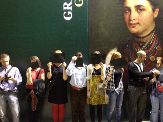 Более десяти украинских художников устроили акцию против цензуры в искусстве, закрыв на открытии выставки лица черными квадратами. Заболотная заявила журналистам, что она закрасила картину черной краской, поскольку ее содержание могло “оскорбить чувства верующих”.