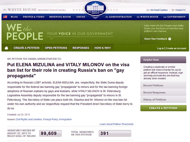 Согласно информации на сайте, автор обращения находится в Сан-Франциско. Поводом для инициативы стало принятие закона о запрете гей-пропаганды. Авторы петиции считают, что Милонов и Мизулина "лично ответственны за дискриминацию сексуальных меньшинств в России". В случае если инициатива соберет 100 тысяч подписей, администрация президента США должна будет дать свой ответ на требования, напоминает РИА "Новости".