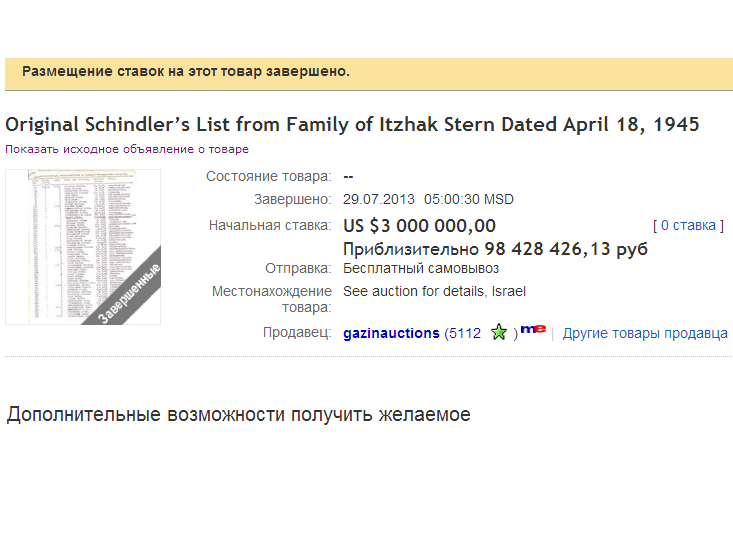 Размещенный на площадке онлайн-аукциона eBay документ содержит на 14 печатных страницах имена 801 спасенного от смерти. Хозяева списка, коллекционеры из Калифорнии Гэри Зимет и Эрик Гэзин, назначили стартовую цену в три миллиона долларов. Они намеревались получить за него до пяти миллионов долларов, однако никто так и не захотел купить уникальный исторический документ.