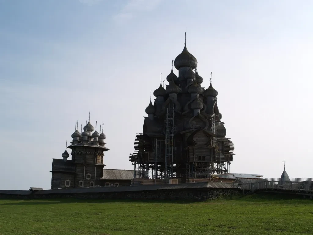 Знаменитый Преображенский храм, 22-главый, построенный без единого гвоздя, сейчас висит в воздухе. Зрелище фантастическое: внизу метров на шесть возвышаются уже отреставрированные венцы, затем — пустота, выше — ряды кокошников, барабаны и главки. Держатся верхние ярусы на металлических фермах. Процесс реставрации должен завершиться в 2018 году: еще минимум четыре года можно будет увидеть исключительные по сложности (и зрелищности) работы.