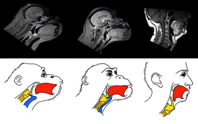Про гортань впервые стали говорить в 40-е годы. Когда в Йельском приматологическом центре пытались научить шимпанзе Вики говорить. Ей удалось произнести только 4 словаpapa, mаmа, cap (чашка), up (вверх). Тогда сообразили, что, видимо, строение гортани немного не то – связки идут под косым углом, само строение гортани не совсем человеческое, не «двуногое», скажем так.