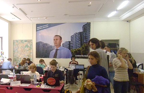 В предвыборном штабе Навального. Фото: Андрей Винокуров/ Полит.ру На вопрос корреспондента «Полит.ру» о стратегии развития города - по пути какой из других столиц пойдет Москва в случае избрания Навального - кандидат снова начал говорить о борьбе с коррупцией и прозрачности бюджета города.