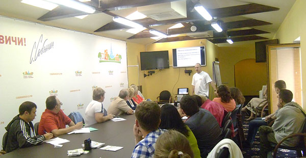 Тренинг в штабе Собянина. Фото: Андрей Винокуров/Полит.ру Отдельно было сказано о недопустимости курения на пикете - если запрет на курение в публичных местах будут нарушать представители врио мэра Москвы, получится совсем некрасиво. Тренер припомнил случай, когда каких-то волонтеров, курящих перед зданием их штаба, сфотографировали проходящие мимо граждане. Не стоит питаться на тумбочках для пикета, а вот следить за чистотой маек - обязательно. Официальный цвет компании Собянина – белый, а, значит, и майки агитаторов должны быть соответствующими.