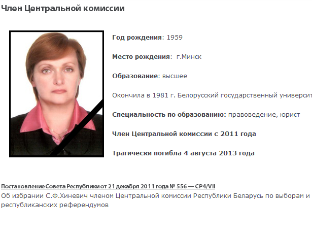 В Минске «трагически погибла» член Центризбиркома Белоруссии Светлана Хиневич, сообщает сайт ведомства.