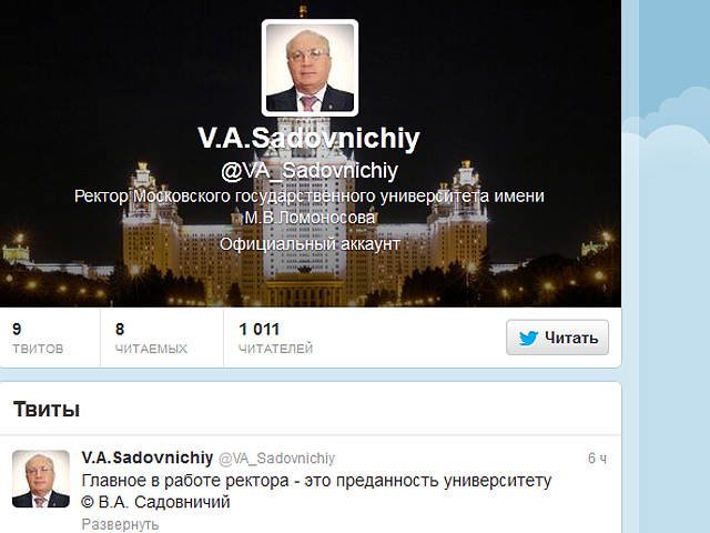 Официальный микроблог Садовничего в Twitter создан 12 августа, на него уже подписались более 700 человек. "Вся информация вводится пресс-службой университета и утверждается ректором. Официальная страница носит живой и динамичный характер, постоянно обновляется и изменяется. Это не личный аккаунт Виктора Антоновича, а официальный, на котором появляются избранные цитаты, краткие высказывания, принадлежащие как ректору, так и уважаемым им мыслителям и ученым. Есть неизбежный процесс, которой называется троллингом, когда появляются твиттер-аккаунты известных людей или организаций, и часть интернет-сообщества реагирует негативно", - цитирует главу пресс-службы МГУ Татьяну Вишневскую РИА "Новости".