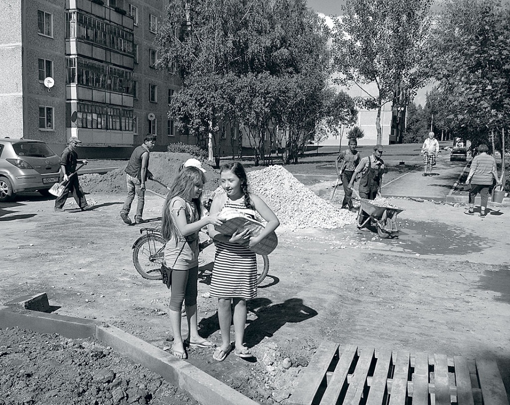 В поселке шумно и необычно оживленно: идет глобальное благоустройство. Бригада из 80 азербайджанцев сдирает асфальт и кладет новый, ремонтирует подходы к домам, тротуары, парковки, высаживает клумбы, устанавливает детскую площадку с прорезиненным покрытием. Стройку контролирует лично гендиректор компании-подрядчика Икрам Абдулаев. Он передвигается почти бегом, бурно жестикулирует, показывает рабочим, как должен лежать асфальт на парковке, чтобы вода после дождя текла в водосток. После каждой своей реплики спрашивает: «Хорошо?» — и, не дожидаясь ответа, бежит дальше. Так же бегают за ним и рабочие: на момент приезда корреспондента The New Times до сдачи «объекта» комиссии оставалось всего пять дней.