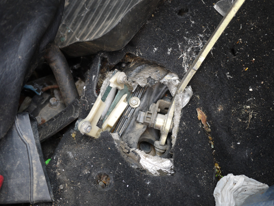 Допрошенный в судебном заседании эксперт сообщил суду, что деформация верхней перемычки бежевой пластмассовой детали может произойти только в том случае, если была включена задняя передача - и рычаг сильно потянуть вправо. Только при включении задней передачи язычок (рядом с гайкой на фото) входит в зацепление с этой бежевой деталью.
