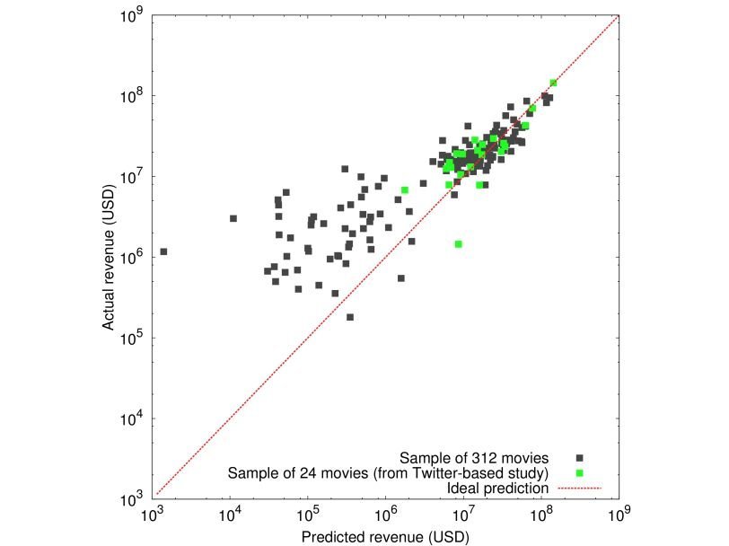 Мартон Местьян (Márton Mestyán), Таха Яссери (Taha Yasseri) и Янош Кертес (János Kertész) предлагают оценивать активность редакторов и количество просмотров страницы о готовящемся фильме в Википедии для оценки его будущей популярности и кассовых сборов. Для отработки методики они использовали данные о 312 фильмах, которые вышли на экраны в США в 2010 году. Разработанный ими метод анализа дает хорошие прогнозы уже за один месяц до появления картины в кинотеатрах. При анализе учитывались: количество просмотров статьи, количество пользователей, которые вносили изменения, количество самих изменений и его один показатель – коэффициент строгости, основанный на том, какое количество правок подвергаются в дальнейшем пересмотру.