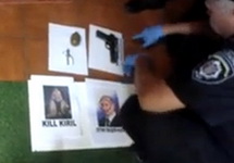 Позже активисток пригласили в помещение и провели второй обыск в их присутствии. Тогда милиционерами были обнаружены боевой пистолет и граната, а также портреты президента России Владимира Путина и патриарха Московского Кирилла с нарисованными на их лицах мишенями. "Мы убеждены, что все эти вещи были подложены во время первого осмотра", - заявила Шевченко.