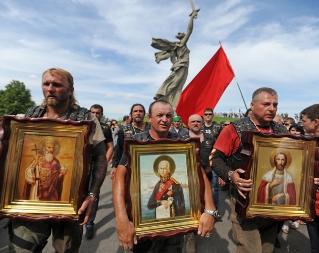 Участники общества байкеров «Ночные волки» на Мамаевом кургане на международном патриотическом байк-шоу «Сталинград». Фото: ИТАР-ТАСС / Дмитрий Рогулин