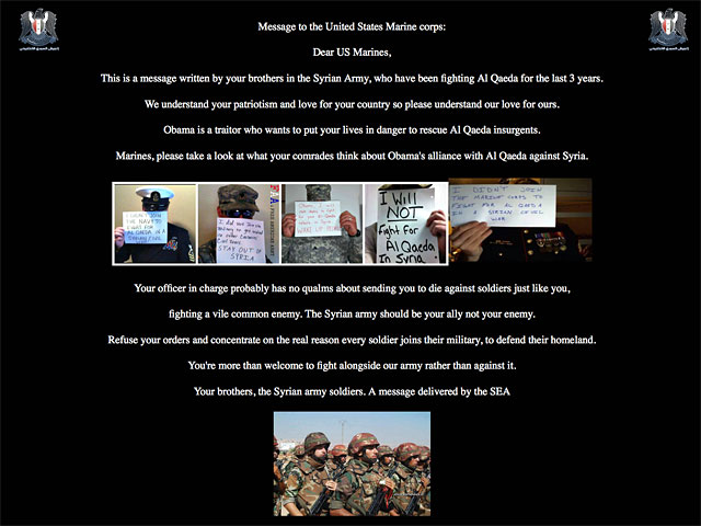 На сайте морпехов хакеры поместили сообщение от лица военнослужащих сирийской армии: "Армия Сирии должна быть вашим союзником, а не врагом" - сообщает издание International Business Times.