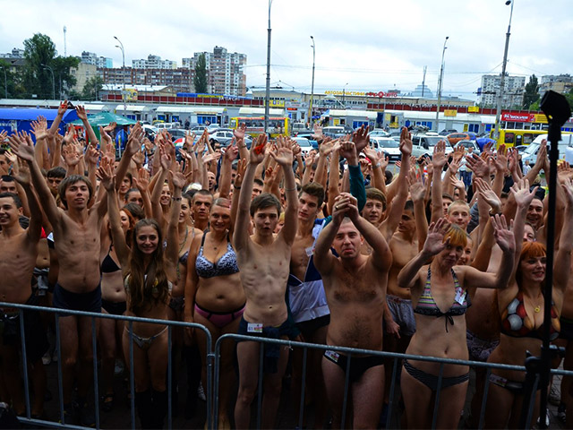 Один из торговых центров Киева провел в последний день лета резонансную акцию "экстремального шопинга" под лозунгом "Пришла раздетой - ушла одетой". Она собрала возле комплекса полторы сотни полуголых людей, не только женщин, но и мужчин, которые отчаянно мерзли на входе под дождем в надежде бесплатно принарядиться. Удалось это, правда, далеко не многим, зато по блогам и украинским СМИ разошлись фотографии с этого мероприятия, сдобренные издевательскими комментариями.