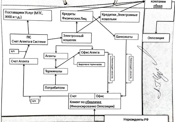 Тому подтверждение еще один документ, скромно обозначенный как приложение к протоколу на одном листе. Лист этот к содержимому протокола в рамках дела о продаже мандатов не имеет ровно никакого отношения, а представляет собой некую схему финансирования оппозиции. Происхождение документа неясно, понятно только, что Черняков не чертил эту схему сам, а лишь оставил на ней свой автограф. Так что схема либо нарисована со слов «арестанта-потерпевшего-агента» Чернякова, либо изготовлена где-то еще и предложена ему на «опознание».