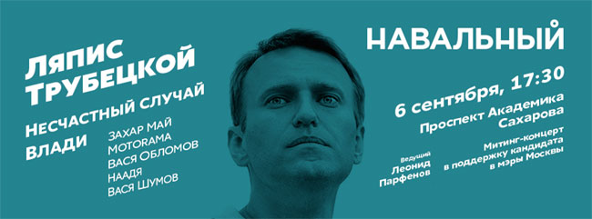 6 сентября в 18:00 на проспекте Сахарова состоится согласованный митинг-концерт в поддержку кандидата в мэры Москвы Алексея Навального. Ведущий - Леонид Парфенов.