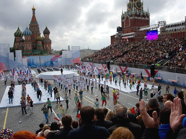 Как сообщает "Интерфакс", проход к Мавзолею и Кремлевской стене закрыт на весь день. ИТАР-ТАСС рапортует, что посмотреть программу собрали 7,5 тысяч "приглашенных гостей": "среди них почетные жители Москвы, ветераны, победители различных конкурсов, представители школ, соцзащиты, заслуженные артисты, зарубежные гости". Всем раздали красные сердечки и теплые пледы.