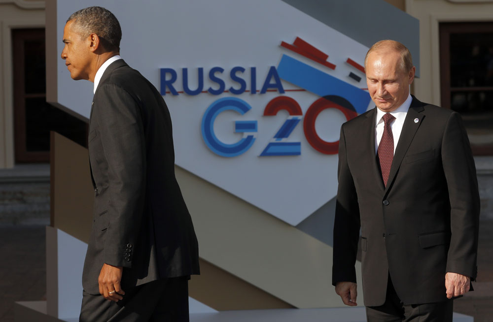 Бронированный кадиллак президента США торжественно въехал в огромный двор Константиновского дворца. Мало того что это была не протокольная российская машина, как у других лидеров саммита G20, а привезенный с собою автомобиль, так и ехал он нарочито медленно, заставляя встречающего гостей Владимира Путина стоять в одиночестве. Подъехав к желтой баллюстраде, машина остановилась, но в течение долгих 20 секунд из нее никто не выходил. Владимир Путин продолжал ждать. Наконец, из передней двери неспешно вышел охранник, не торопясь открыл заднюю дверь, из которой без тени улыбки на лице вышел Барак Обама, заранее протягивая руку Путину: улыбались президенты только потом для фотографии. Ангела Меркель, премьер-министр Германии, чуть позже, как рассказывают, пошутила: Путин и Обама как старая семейная пара — «постоянно ругаются, но никак не могут развестись».