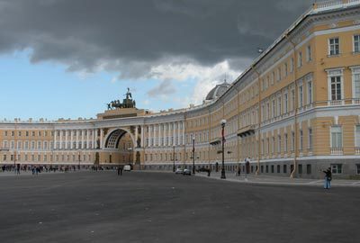 © «Гранитострой» На Дворцовой площади в Петербурге открылось после реставрации восточное крыло здания Главного штаба, принадлежащего Государственному Эрмитажу. Стоимость работ составила 13,5 млрд. рублей.