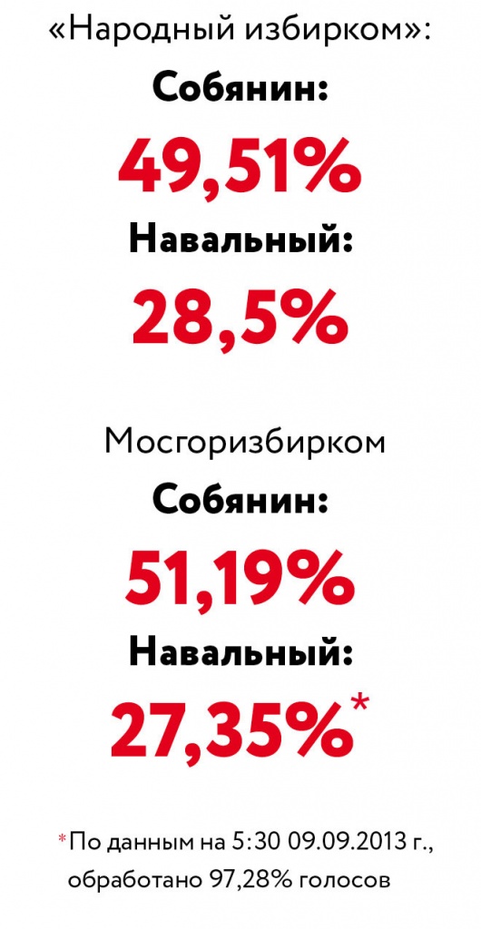 Накануне выборов 8 сентября Мосгоризбирком обещал, что мы узнаем имя нового мэра столицы еще до полуночи. Однако еще до полуночи стало понятно: у Сергея Собянина — проблемы. В то время, когда официальные счетчики извещали, что врио мэра набирает 57,5%, а на Болотной площади собирали митинг победителей, данные «Народного избиркома» (SMS-ЦИК), организованного Альянсом набюдателей, который вел параллельный подсчет голосов, показывали: второй тур — вполне реален. Проценты Собянина постоянно шли вниз, балансируя на грани 50%. В 2.30, когда оставались необработанными протоколы чуть больше 1000 избирательных участков (всего их было 3411), SMS-ЦИК зафиксировал свои результаты: Собянин — 49,7%, Навальный — 28,3%. Официальные счетчики давали врио мэра на полтора процента больше. Руководитель штаба Навального Леонид Волков заявил: «Преимущество Собянина — это результат фальсификации во время голосования вне избирательных участков». И действительно, по данным «Народного избиркома» процент голосовавших на дому — 4,6% оказался больше, чем на президентских выборах в марте 2012 года, и почти в два раза больше, чем на выборах в Государственную думу в 2011 году (см. репортаж на стр. 6). «Надо признать: эти выборы были на порядок добросовестнее, чем предыдущие», — сказал The New Times в 3 часа ночи руководитель проекта «Народный избирком» политолог Дмитрий Орешкин. И добавил, что учитывая ресурс, который был у мэрии и Кремля, победа Собянина с результатом 51,37 % — это очевидный проигрыш партии власти, в то время как результат Навального, которому провластные социологи предсказывали от 13% до 22%, это серьезная заявка на будущее.