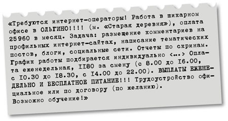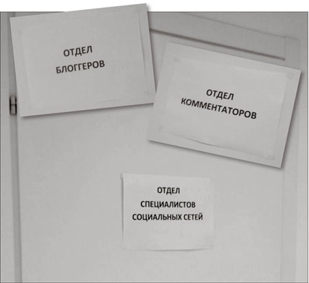 Пятнадцать минут езды от метро "Старая Деревня", напротив железнодорожной станции Ольгино. Огромный белоснежный коттедж. Охранник, секретарь и кабинеты с надписями "Управление блогеров и комментаторов", "Отдел быстрого реагирования", "Отдел CEO", "Журналисты", "Креативный отдел", "Отдел комментаторов", "Отдел блогеров", "Отдел специалистов социальных сетей". На третьем этаже – кабинет руководства и конференц-зал.