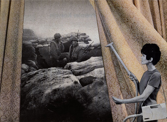 — Мне кажется, у меня была нетипичная история. По одной причине: мне было все равно, буду ли я успешной художницей, получу ли поддержку музеев и галерей, оценят ли меня ведущие критики. Я понимала, что если я собираюсь делать социально-критическое искусство, то музеи не будут показывать мои работы, а критики будут только насмехаться. Я никогда не искала возможности выставиться в коммерческой галерее, да и шанс мне такой в течение долгого времени не подворачивался. Вместо этого я зарабатывала преподаванием. Как говорил Брехт, не ожидай наград от общества, которое бичуешь. Но другой момент, касающийся «Войны с доставкой на дом», состоит в том, что эта работа находилась вне художественных институций в течение Вьетнамской войны, которой она была противопоставлена. Коллажи распространялись в виде флаеров и листовок, все это публиковалось несколькими подпольными газетами. Такого рода издания в большом количестве читались молодыми людьми, рожденными после Второй мировой войны и принадлежавшими, как принято говорить, к поколению бейби-бума. Тогда в США люди младше 25 лет были самой большой социальной группой. В 1960-х мы были очень молодым обществом.