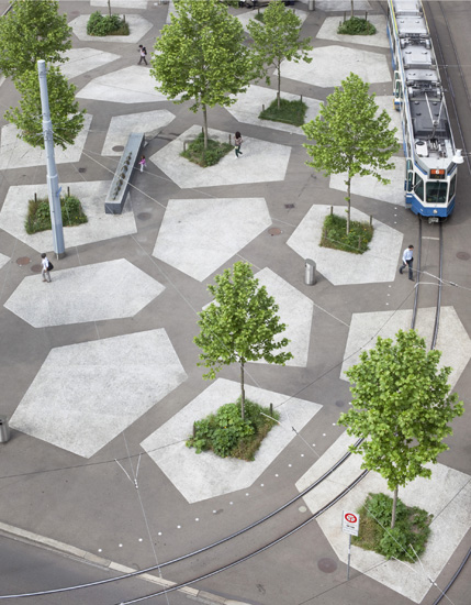 Тессинер Платц, Цюрих, 2006 «Швейцарский вклад в ландшафтную архитектуру» — это 36 иллюстрированных планшетов, которые рассказывают о том, как развивался ландшафтный дизайн в Швейцарии последние десятилетия и каковы его основополагающие принципы (к слову, принципы эти за несколько десятков лет почти не изменились). Здесь и краткая история того, как зарождалась парковая культура, на примерах садов в Лозанне, Базеле, Винтертуре, Берне, и лучшие архитектурные проекты современных национальных бюро (Herzog & de Meuron, ASP Landschaftsarchitekten AG, Bernard Tschumi Architects, Conzett Bronzini Gartmann AG), и остроумные решения сегодняшних швейцарских архитекторов и дизайнеров «новой волны». На установленных в зале экранах нон-стоп крутятся видеоролики, рассказывающие о создании крупнейшего цюрихского парка Irchelpark (ASP Landschaftsarchitekten AG), реконструкции горного района Orselina-Cardada и картезианского монастыря La Valsainte Charterhouse в Cerniat.