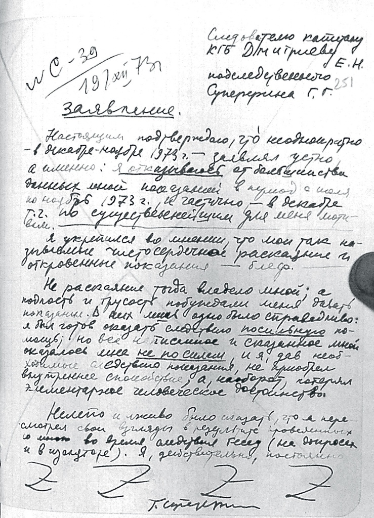 | ********Заявление на имя следователя КГБ Дмитриева Е.Н. датировано 19 декабря 1973 г. Вот отрывок из заявления: «...я укрепился во мнении, что мое так называемое чистосердечное раскаяние и откровенные показания — блеф. Не раскаяние тогда владело мной, а подлость и трусость побуждали меня дать показания. В них лишь одно было справедливым, я был готов оказать следствию посильную помощь, но все написанное и сказанное оказалось мне не по силам, и я, дав необходимые следствию показания, не приобрел внутреннее спокойствие, а наоборот, потерял элементарное человеческое достоинство...» |