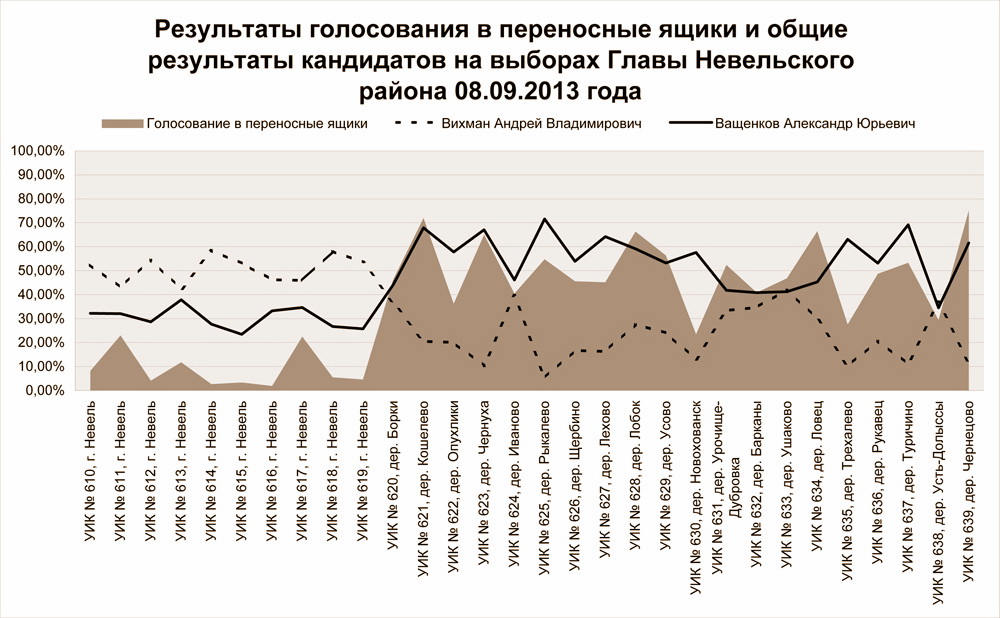 Притча во языцех – Невельский район. Статистика голосования по участкам показывает: в каждом третьем случае рост числа проголосовавших на дому сопровождается параллельным ростом числа голосов за кандидата от «Единой России» Александра Ващенкова.