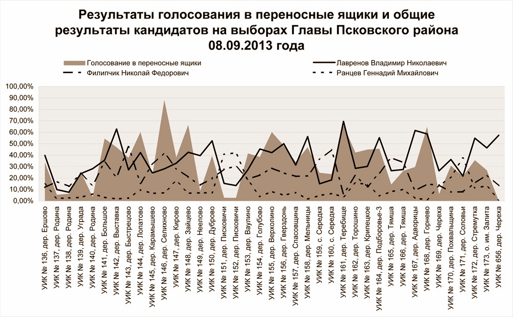Обратим внимание на официальные результаты выборов, состоявшихся в Псковской области 8 сентября 2013 года по территориям, к результатам выборов на которых возникли вопросы именно в связи с голосованием в переносные ящики.