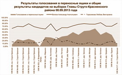 Только на городском избирательном участке № 498 в пос. Струги Красные в переносные ящики проголосовали 7,39% избирателей, что не выглядит вызывающим. Результаты кандидатов меняются сразу же на 10 пунктов: за Александра Волкова на этом участке проголосовали 62,82% избирателей, за идущего вторым за ним кандидата от «Яблока» Любовь Герасимову – 16,40%.