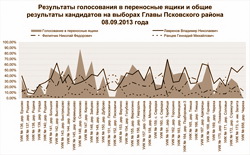 Но общий «баланс усилий» привел к тому, что Владимир Лавренов получил 2875 голосов (30,53%), при этом 2604 избирателя Псковского района проголосовали в переносные ящики.