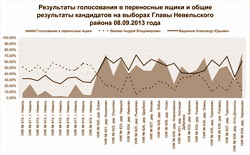 Практически все пики голосования за кандидатуру Александра Волкова по избирательным участкам совпадают с подъемами голосования в переносные ящики для голосования, а относительное снижение уровня поддержки – с сокращением доли голосования за пределами избирательного участка.