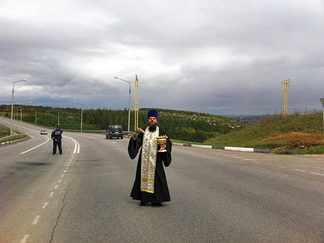 В Белгородском районе Белгородской области представители местной епархии Русской православной церкви окропили святой водой дороги, которые считаются здесь наиболее аварийными. Об этом накануне рассказали в пресс-службе УМВД по региону.
