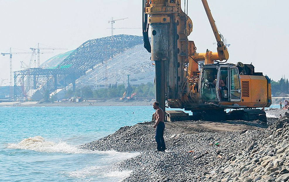 Строительство инженерной защиты на Имеретинском пляже, на заднем плане — стадион «Фишт»