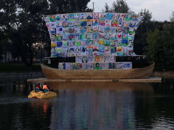 Книга «Плывет кораблик в гости», 1979, с иллюстрациями Ильи Кабакова Нет смысла пускаться в длинный экскурс о влиянии детского рисунка (и отдельно — эстетики детства, в том числе детской иллюстрации) на искусство XX века и на современное искусство. Детский мир — это та гавань, в которой надеется причалить и корабль Кабаков. Но Кабаковы не заметили другого. Время безликой гигантомании прошло. В сегодняшнем мире у детей есть права, имена и лица. И мне искренне кажется, что маленький кораблик из бумаги, сделанный конкретным ребенком и бережно выпущенный на поверхность венецианского канала или маленькой речушки в российской глубинке, куда красивее и ближе к детскому и просто к человеческому миру, чем недвижимый корабль абстрактной толерантности. Что ж до художественной концепции — думаю, она очевидна.