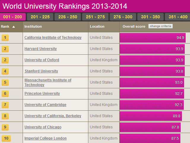 Лидером рейтинга уже третий год является Калифорнийский технологический институт. Гарвардский университет (США) занял второе место, поднявшись с четвертого, и разделил его с британским Оксфордским университетом. Стенфордский университет (США) опустился с общего второго на четвертое место, а американский Массачусетский технологический институт занял пятое место. Соединенные Штаты сохраняют лидерство в рейтинге, американские вузы занимают семь из десяти верхних позиций.