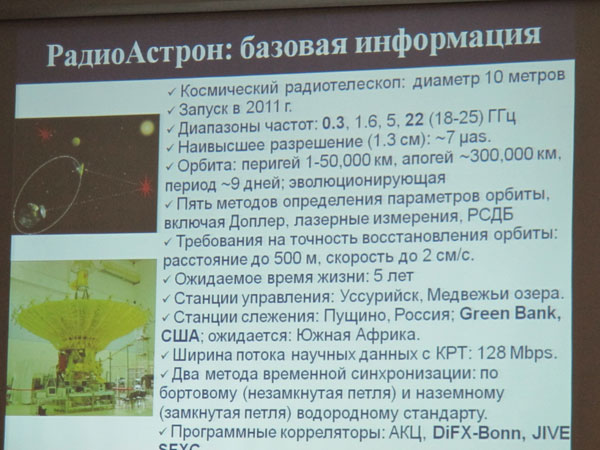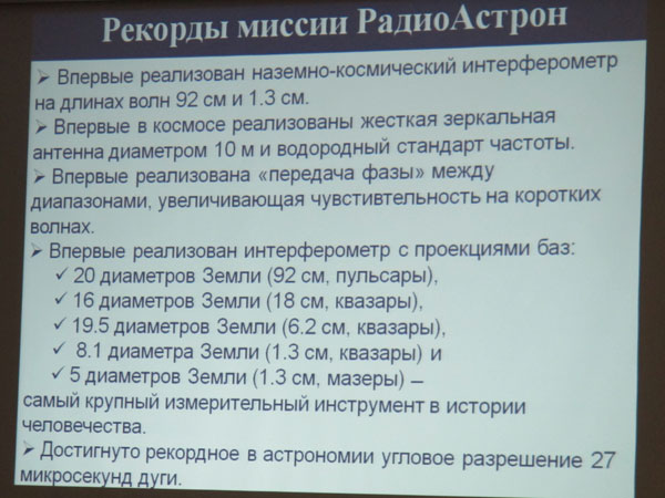 Основные характеристики проекта "РадиоАстрон" (один из слайдов Ю. Ковалева) «Во-первых, мы получили принципиально новый результат, который в принципе нельзя было проверить на Земле – измерить истинную яркость ядер активных галактик. На Земле интерферометры не позволяли нам провести подобное измерение. Почему это важно? Есть теоретическая модель, и проверить ее можно было только в результате космического эксперимента. РадиоАстрон дал нам такую возможность, и оказалось, что результаты наблюдений не согласуются с предсказаниями, которые дает общепринятая модель ядер активных галактик», – отметил Юрий Ковалев в своем комментарии.