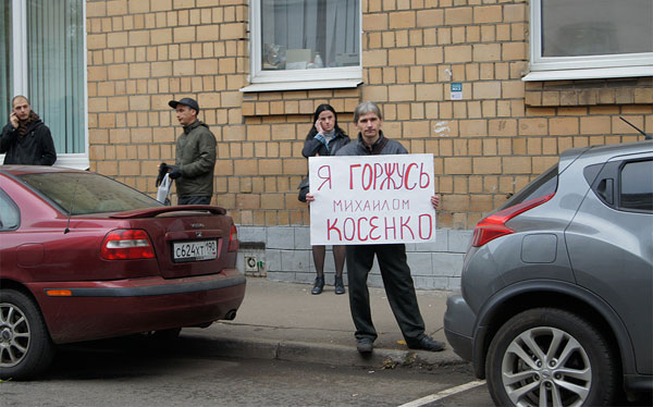 На улице тем временем собрались больше 100 человек, сочувствующих обвиняемому. Кто-то стоял в одиночном пикете. По заявлениям ряда СМИ, не обошлось и без задержаний. Появление Косенко в сопровождении конвоиров толпа встретила криками «Свободу!» и аплодисментами. Сам обвиняемый держался спокойно и уверенно, не производя впечатление невменяемого и опасного человека. Когда его ввели в «клетку» в зале суда, он коротко переговорил с Алексеевой. Она расплакалась и уверяла, что им удастся освободить Косенко: «Миша, мы тебя вытащим. У нас есть опыт в этих делах».