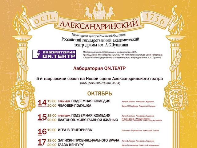 "В октябре и ноябре зрители смогут увидеть как хорошо знакомые постановки молодых петербургских режиссеров, так и премьеры - несмотря на сложные условия работы, до конца сезона Лаборатория планирует пополнить свой репертуар семью новыми спектаклями", - говорится на сайте Александринского театра.