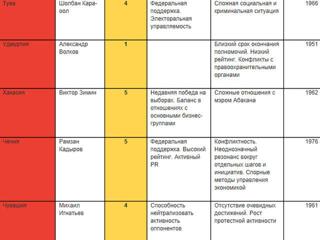 Наибольшие шансы дольше удержать власть, по мнению экспертов, у главы Дагестана Рамазана Абдулатипова, Игнушетии Юнус-Бека Евкурова, губернатора Хакасии Виктора Зимина, главы Чечни Рамзана Кадырова, Константина Ильковского из Забайкальского края, главы Хабаровского края Вячеслава Шпорта, губернатора Амурской области Олега Кожемяки.
