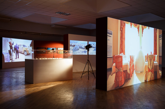 © Никита Шохов Вид экспозиции, на первом плане «Пространство торжества» (2013). Фото предоставлено фондом «Пери» Работа Таус, видео «Пространство торжества», продолжает эту линию. Здесь мы видим интерьеры банкетных залов, где проводятся традиционные дагестанские свадьбы, но тут нет всех тех обрядов и костюмов, диспозиций жених/невеста/гости, которые мне приходилось видеть в фотопроектах о бракосочетаниях в других культурах, как, например, у Фахрийи Маммадовой в азербайджанском павильоне на нынешней Венецианской биеннале. Пустые залы, застывшие в ожидании торжеств, в видео Махачевой посещают лишь коконообразные фигуры, по всей видимости, рожденные из образа невесты, но получающие новое звучание. Это еще и образы плодородия — что ожидаемо, — напоминающие «круглых» или гороподобных Мадонн из Потоси в Боливии (например, таких), образы вовсе не трогательной неловкости, но стесненности и потерянности в напрочь маскулинном, патриархальном обществе Дагестана.