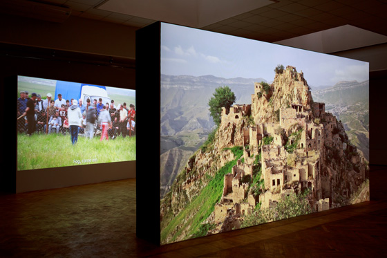 © Никита Шохов Вид экспозиции: на первом плане «Гамсутль» (2012), на втором плане «Позволь мне быть частью нарратива» (2012). Фото предоставлено фондом «Пери» Как я уже писал около полугода назад в связи с биеннале в Шардже, в которой Таус Махачева участвовала с несколькими работами, художница нашла выход из ситуации, резко поменяв и тональность, и направленность своих произведений. Она либо убрала, либо свела до минимального, практически условного присутствия фигуру культурной уникальности — во всяком случае, ее нет в «центре» новых работ; обратилась к вопросам значимым и болезненным не только для Дагестана, но и для всего остального мира. Видео «Гамсутль» (2012), где, на первый взгляд, она обыгрывает очередной «локальный» сюжет, стало тем поворотным пунктом, за которым начинается большая художественная история, поэтому-то в Шардже оно выглядело так уместно и органично в связке с одновременно документальными и фантасмагорическими работами ливанской художницы Ламии Жрейж или поэтическим видео живущего в Мехико бельгийца Франсиса Алюса, у которых все местные, частные истории обретают общемировое или даже вселенское значение. «Гамсутль» — это не просто история, схватывающая отзвуки, увы, многочисленных кавказских войн XIX, XX и XXI столетий, не просто аналитический портрет до предела ритуализированных мест милитаристской визуальности. Опустевшая крепость-аул, воспроизводящий жесты солдат с картин Франца Рубо и взаимодействующий с руинами актер, тихое, неспешное течение фильма ломают наше привычное восприятие того самого Кавказа, про который у нас заранее есть что сказать, хоть мы ничего о нем и не знаем.