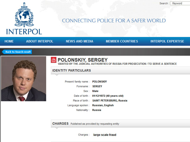Фотография и идентификационные данные российского предпринимателя Сергея Полонского, разыскиваемого властями РФ через Интерпол, появились на сайте международной уголовной полиции. Отныне страны, где есть представительства Интерпола, обязаны задержать Полонского, если он окажется на их территории.